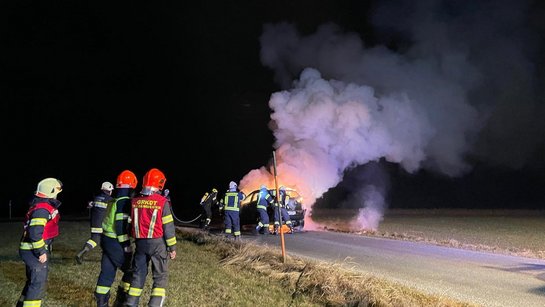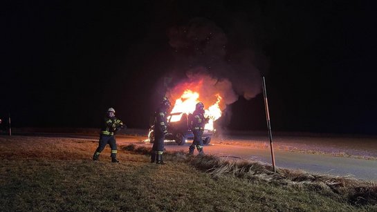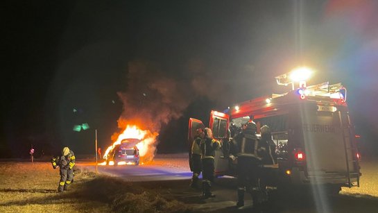 Zahlreiche Kameradinnen und Kameraden beider Feuerwehren rĂŒckten umgehend zum Einsatzort aus. Bei Eintreffen der EinsatzkrĂ€fte stand das Fahrzeug bereits in Vollbrand.